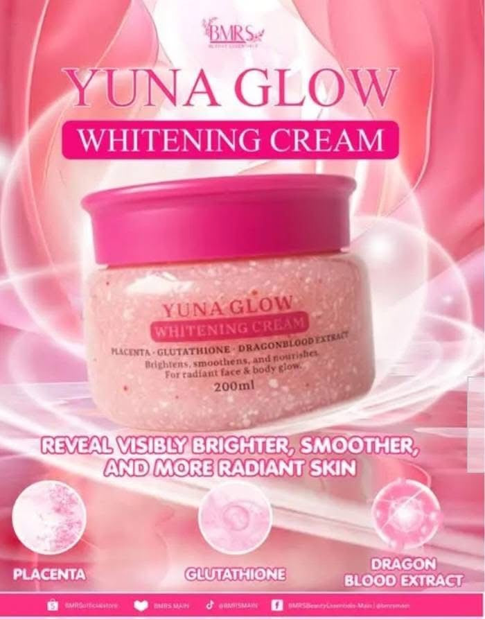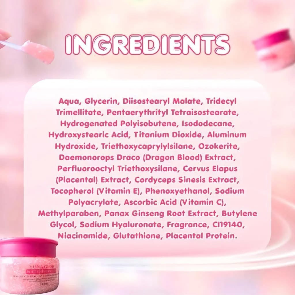 Yuna Glow Whitening Cream combining Placenta Glutathione and Dragon Blood Extract for skin whitening, anti-aging, and rejuvenation for that powerful, lasting glow.