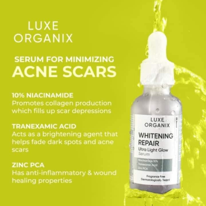 Luxe Organix Whitening Repair Serum is packed with 10% Niacinamide that helps lighten uneven pigmentation, with added benefits of Tranexamic Acid and Zinc it helps smooth out rough and textured skin. This high potent formulation helps fade acne marks and regulate oil production giving you a naturally healthy skin.